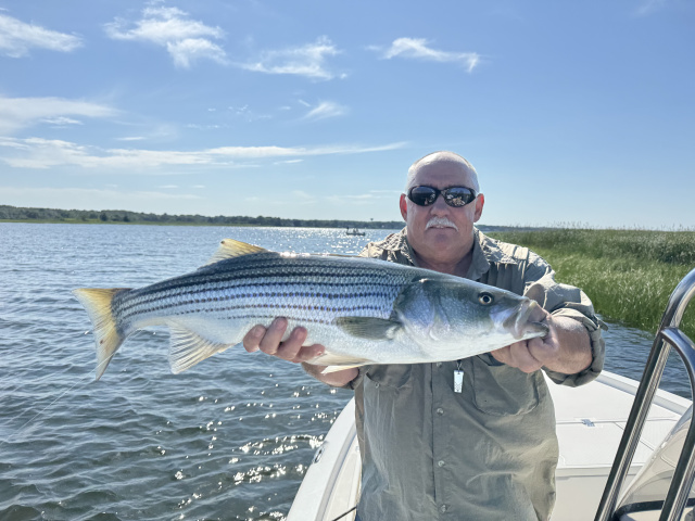 Jerry with a nice Joppa Flats striped bass, on the fly rod